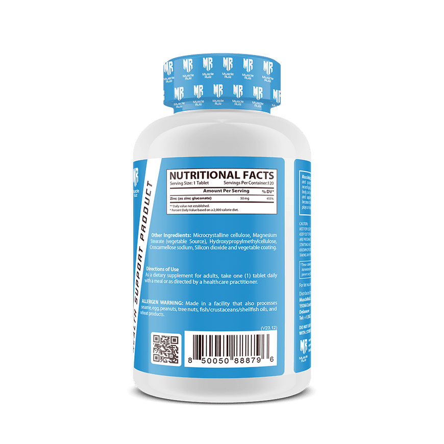 One of the best things you can do for your immune system is to take a Muscle Rulz Zinc 50mg supplement daily. This pure supplement promotes immunity and supports enzyme functions to keep you feeling well throughout the year. Each Muscle Rulz zinc 50mg tablet serves you with 50 mg of zinc for your nutritional needs.